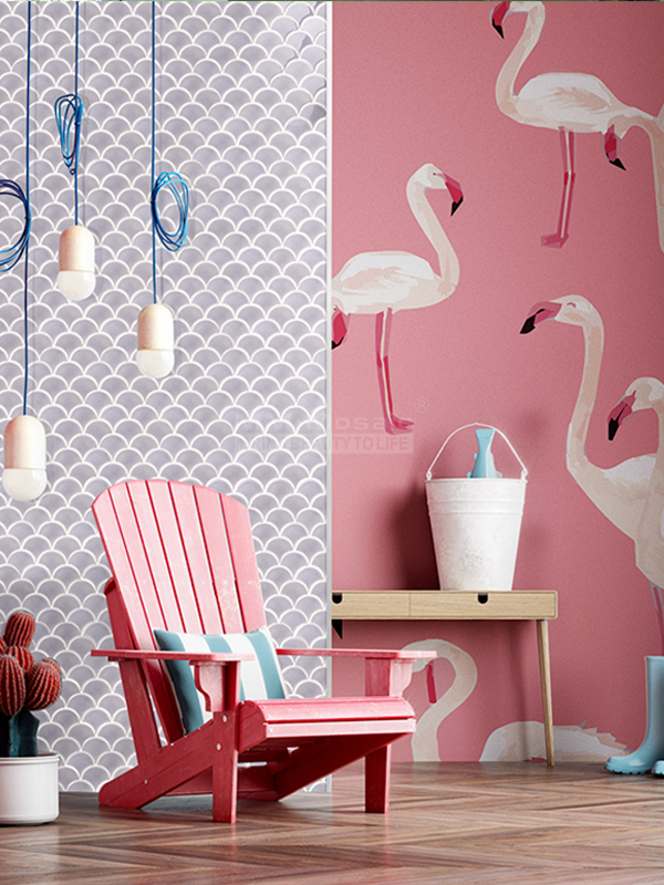 For those who think bigger is better and love outstanding color contrast, this vertical pattern living room wall is perfect for you! The vertical pattern uses our ice crackle gray Fish Scale tile laid out in this special and mosaic way. This wall design combines perfectly with our pink paint and gives off the best color contrast feeling.