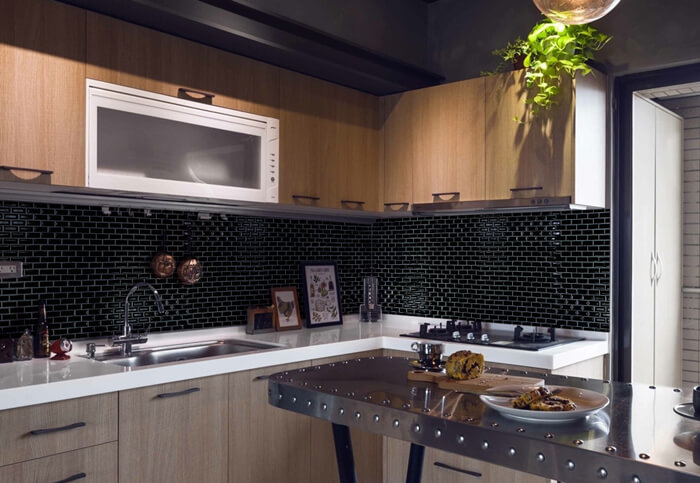 Brickbond is a common tile paving pattern. It appears that tiles are in a stagger placement. People who choose brickbond mosaic tile for kitchen decoration is more conservative and traditional. They think it is a reliable solution that never goes wrong and ends up with a look that is not bad. If you also want to save effort in tile selection, just pick up a ceramic brick tile you like and remember it is better to choose those in solid color such as white and black. They are simple but decorative enough as a kitchen backsplash particularly when many utensils look a little messy on the worktop.