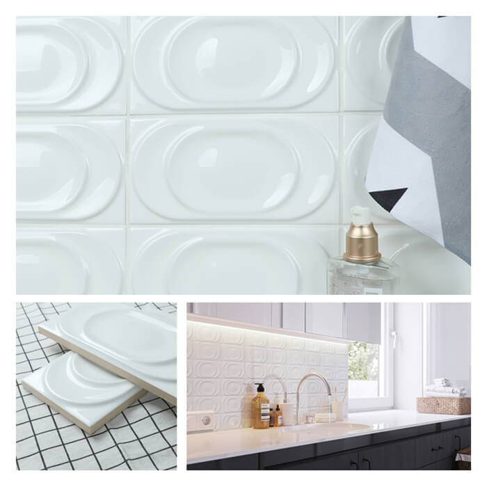 Adding white glossy tile a wavy surface is a good enhancement too. What we have gotten is glittering effect. That means the tile surface reflects light at a different angle and shows a waving pattern which is unobvious but marvelous once you notice it.