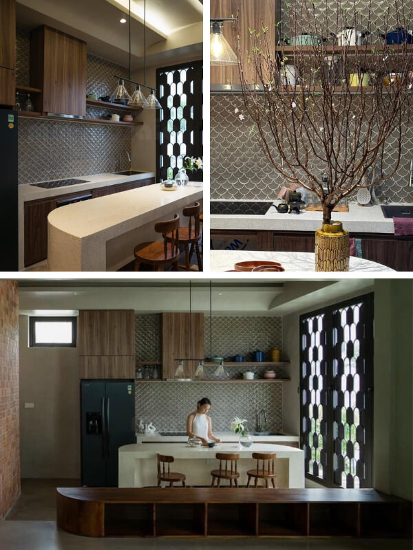 We all love this renovation! this open kitchen with a simple and elegant style is the perfect blend of functionality and aesthetics. The use of deep gray fan-shaped ceramic mosaic, wooden cabinets, stools, and a large white island, all come together to create a warm and welcoming space that is perfect for cooking, dining, and entertaining.