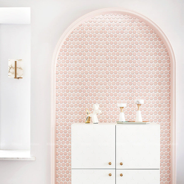 Create a cozy atmosphere with comfortable pink hues like this interior design did with our newest penny mosaic tile. While using a unique warm hues color, for example, pink, you can decorate or rebuild any room of your home. Head for our blog “Style Selection: 28mm Pretty Pink Penny Round Ceramic Tile>>>” to browse different space how to use our pink penny mosaic.