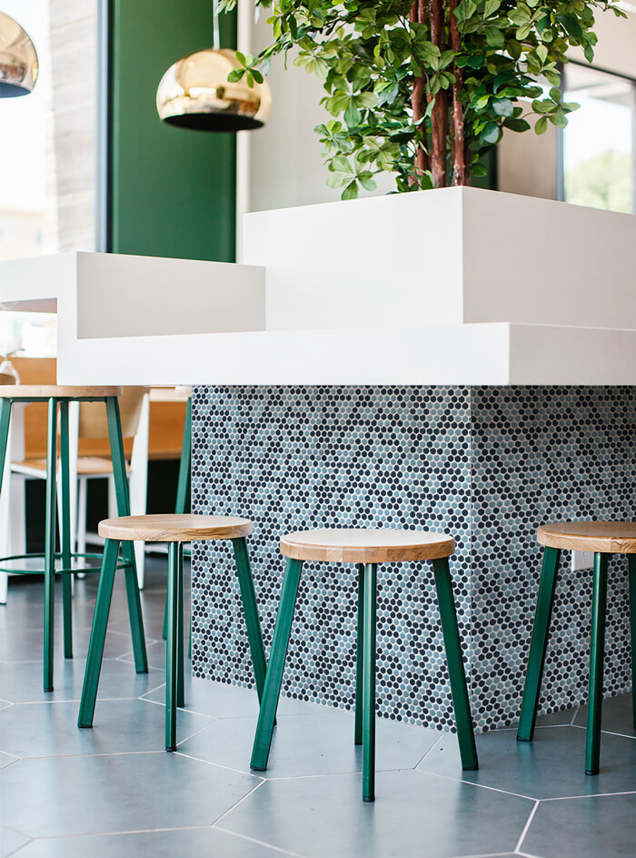 Penny tile mosaic is absolutely a staple of commercial new construction. In the restaurant where is minimalist and clean, the blue mixed round mosaic provides a chic look and visual textures, which makes the space become the eye-catcher and become more inviting and welcoming.